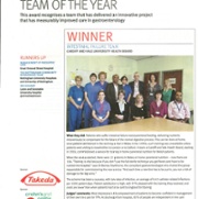 Oherwydd gwaith caled ac ymroddiad ein tîm i sefydlu'r gwasanaeth hwn, gwnaethom ennill gwobr Tîm Gastroenteroleg y Flwyddyn BMJ ar gyfer y flwyddyn 2015. Mae hon yn wobr fawreddog ac mae'n amlygu pa mor bwysig yw ein gwaith i'n cleifion. Gallwch ddarllen sylwadau'r beirniaid yma —